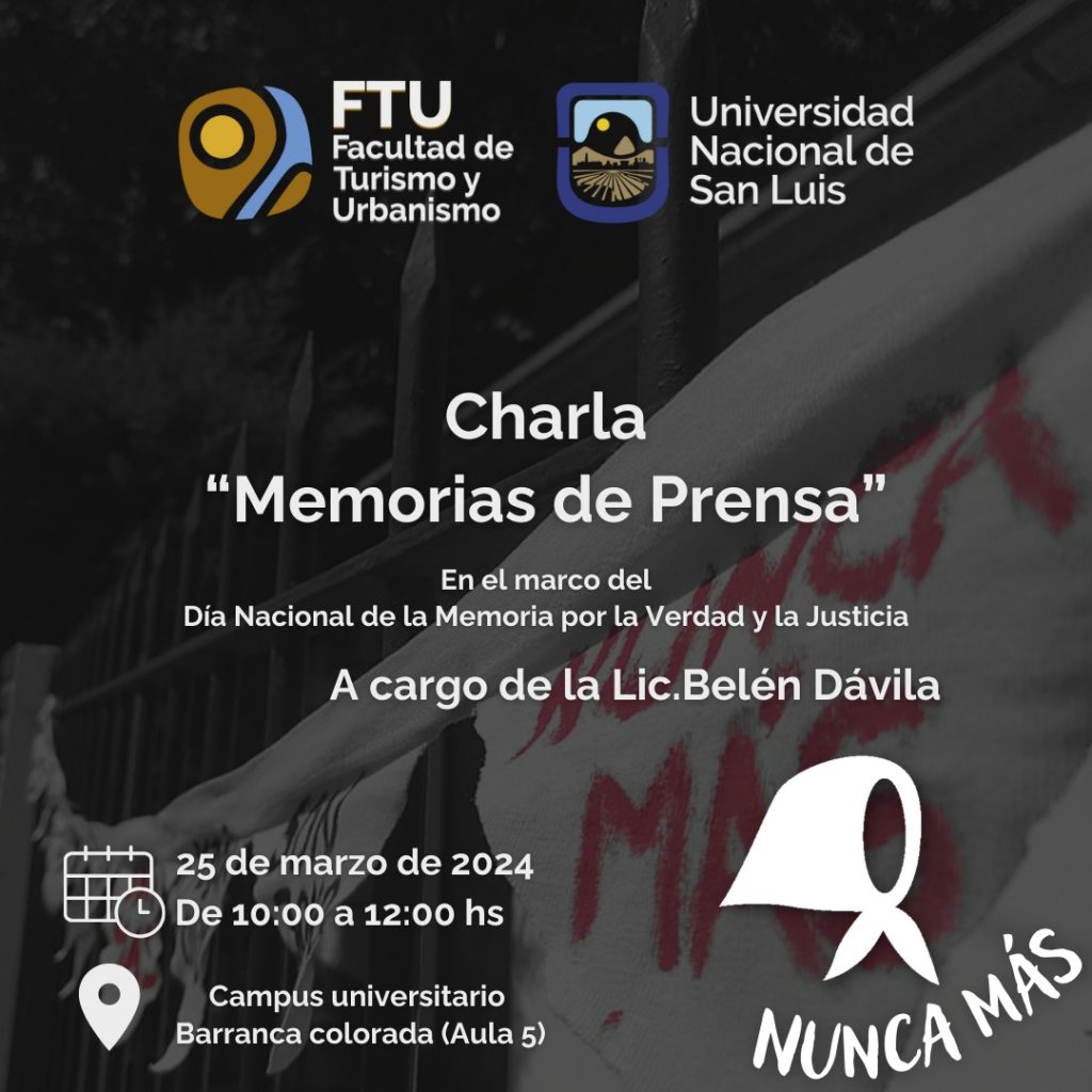 La Universidad Nacional de San Luis (UNSL) y la Facultad de Turismo y Urbanismo (FTU) organizan la presentación de la revista: Memorias de Prensa, una rectificación de las noticias publicadas durante la última dictadura cívico-militar en San Luis, en los tres (3) medios de prensa de circulación en la época. La charla estará a cargo de la Lic. Belén Dávila.