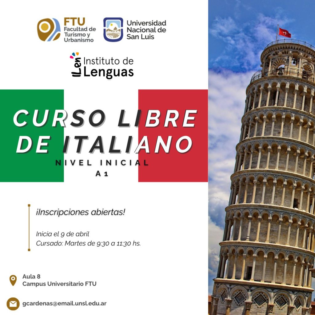 El Instituto de Lenguas (ILen) de la Universidad Nacional de San Luis (UNSL) informa que se encuentra abierta la inscripción al curso de Italiano, Nivel A1 Inicial, que se dictará en la Facultad de Turismo y Urbanismo (FTU). Inscripciones abiertas hasta el 9 de abril.