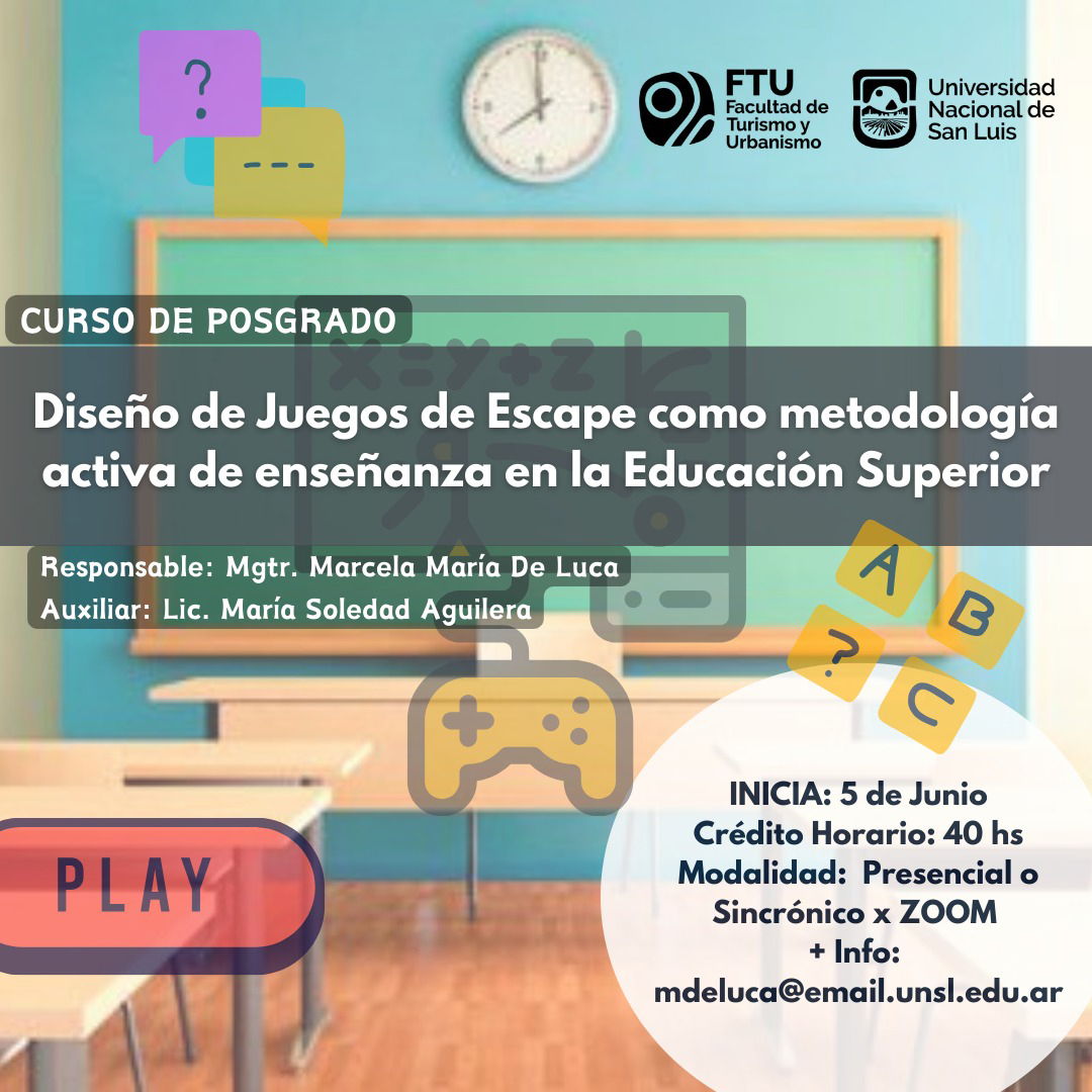Desde la Secretaría de Investigación y Posgrado de la Facultad de Turismo y Urbanismo (FTU) se dictará el Curso Juegos de Escape como metodología activa de enseñanza en la Educación Superior. Inicia miércoles 5 de junio. Responsable del dictado Mgtr. Marcela De Luca, docente de la FTU.