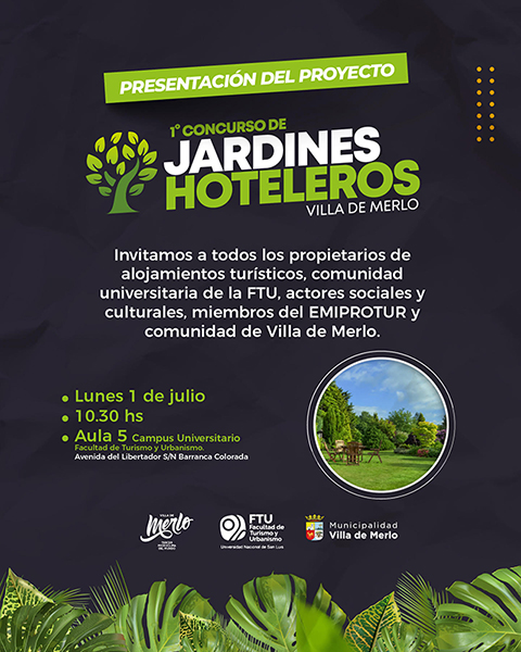 Este lunes 1 de julio a las 10.30 Hs en el Campus de la FTU en Barranca Colorada se llevará a cabo el lanzamiento del “1º Concurso de Jardines Hoteleros: Villa de Merlo”, organizado por el Decanato y la Secretaría de Extensión y Vinculación de la Facultad de Turismo y Urbanismo de la Universidad Nacional de San Luis, en articulación con la Municipalidad de Merlo desde las Secretarías de Gestión, Calidad y Productos Turísticos y de Ambiente, Producción y Desarrollo Sustentable.