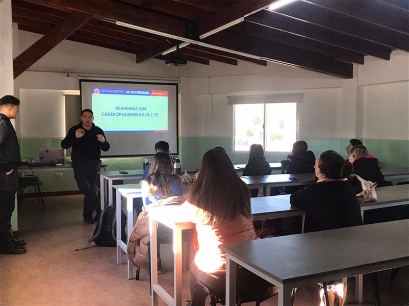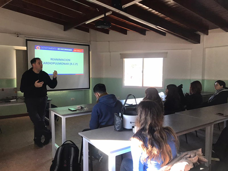 Finalmente se dictó la capacitación, la cual se extendió por un lapso de tiempo de 3 hs reloj, donde los estudiantes y docentes no sólo recibieron conocimientos teóricos, sino que también tuvieron la posibilidad de realizar un simulacro de prácticas de RCP.
