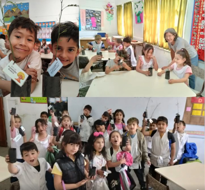 En el marco del Proyecto de Extensión “Desarrollo de Viveros Escolares de Especies Nativas de las Ecorregiones del monte chaqueño y el espinal”, las docentes de la Facultad de Turismo y Urbanismo (FTU) Lidia Reynoso, Gabriela Sánchez y Miriam Leal, visitaron a los estudiantes de primer grado de la Escuela Pública Autogestionada Nº 9 Dr. Horacio de la Mota, quienes contaron sobre lo que habían trabajado con las plantas y los docentes universitarios entregaron a cada estudiante un algarrobo blanco y les explicaron los beneficios de este árbol y los cuidados que tienen que darle.