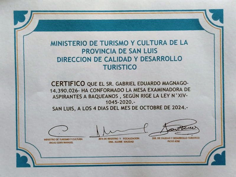 El docente de la Facultad de Turismo y Urbanismo (FTU) Téc. Gabriel Magnago Director de la carrera Guía Universitario de Turismo y profesor responsable de la asignatura Prácticas de Guiado, fue invitado a conformar la mesa examinadora de aspirantes a guías baqueanos de la provincia de San Luis.