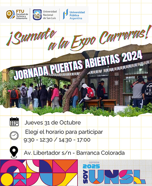 La Facultad de Turismo y Urbanismo (FTU) dependiente de la Universidad Nacional de San Luis (UNSL) realizará la Jornada Puertas Abiertas 2024. Será el jueves 31 de octubre en el Campus Universitario en Barranca Colorada.