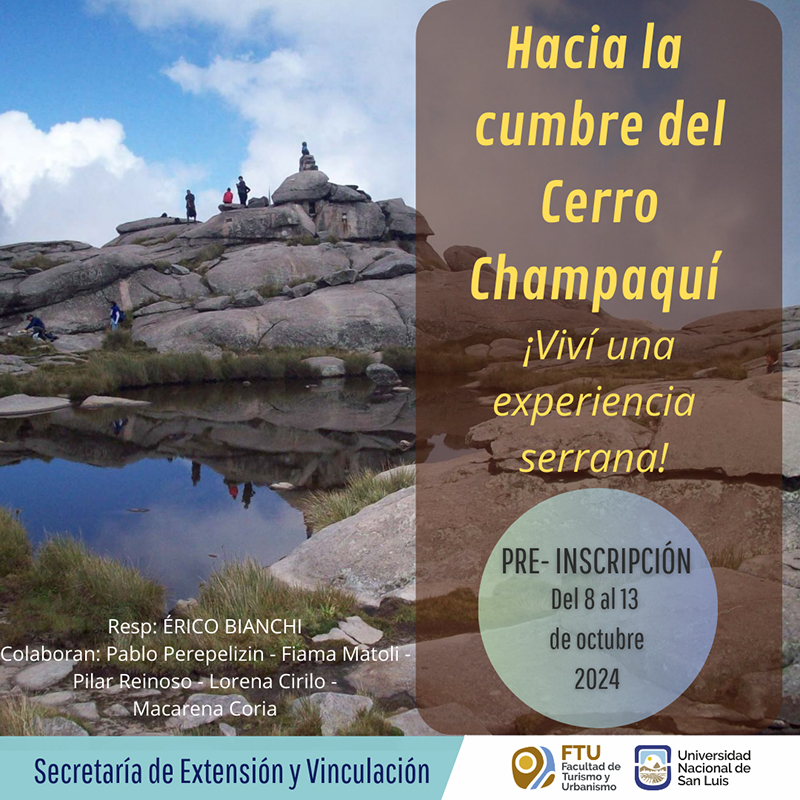 La Facultad de Turismo y Urbanismo (FTU) dictará el Taller de Trekking “Hacia la Cumbre del Cerro Champaquí” – Viví una experiencia serrana. Segunda parte. Preinscripciones abiertas. Cupos limitados. Responsable del dictado Esp. Érico Bianchi.