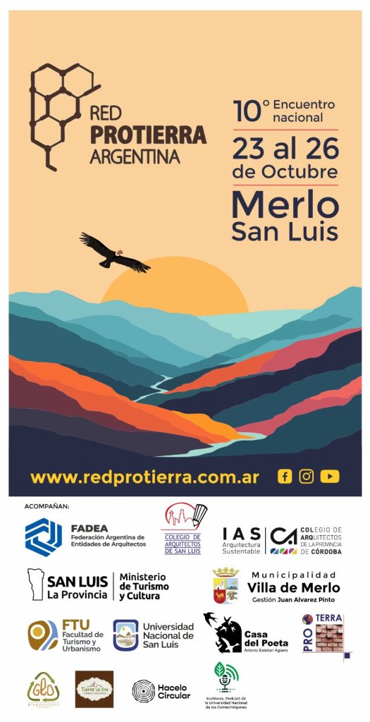 “La Red PROTIERRA constituye una red nacional de integración y cooperación técnica y científica de ámbito nacional, enfocada en el desarrollo responsable de la construcción con tierra en todas sus manifestaciones y aspectos. Dicha Red está formada por personas físicas residentes en el país abocadas a la construcción con tierra y disciplinas afines. Su finalidad es promover y facilitar la utilización responsable del material tierra para el mejoramiento del hábitat en el medio rural y urbano, así como también preservar la diversidad cultural y el patrimonio tangible e intangible, contribuyendo al desarrollo sostenible, social, económico y cultural. Desde la Coordinación de la Red PROTIERRA Argentina agradecemos a la Facultad de Turismo y Urbanismo de la Universidad Nacional de San Luis su aval y acompañamiento para con el 10° Encuentro, y esperamos poder contar con la presencia de la comunidad universitaria”.