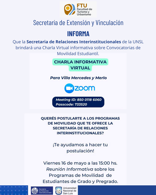 La Secretaría de Extensión y Vinculación de la FTU informa que se encuentran abiertas diferentes convocatorias a Programas de Movilidad Estudiantil para el cursado de materias del segundo cuatrimestre del 2025 que ofrece la Secretaría de Relaciones Interinstitucionales de la Universidad Nacional de San Luis.