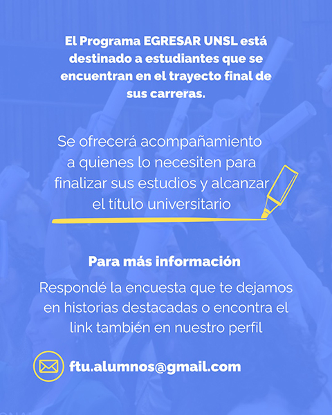 Este Programa es impulsado por la Secretaría Académica de la UNSL, teniendo como objetivo potenciar la finalización de carreras de pregrado y grado y titulación de los/as estudiantes egresables de la UNSL.