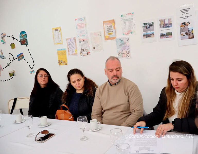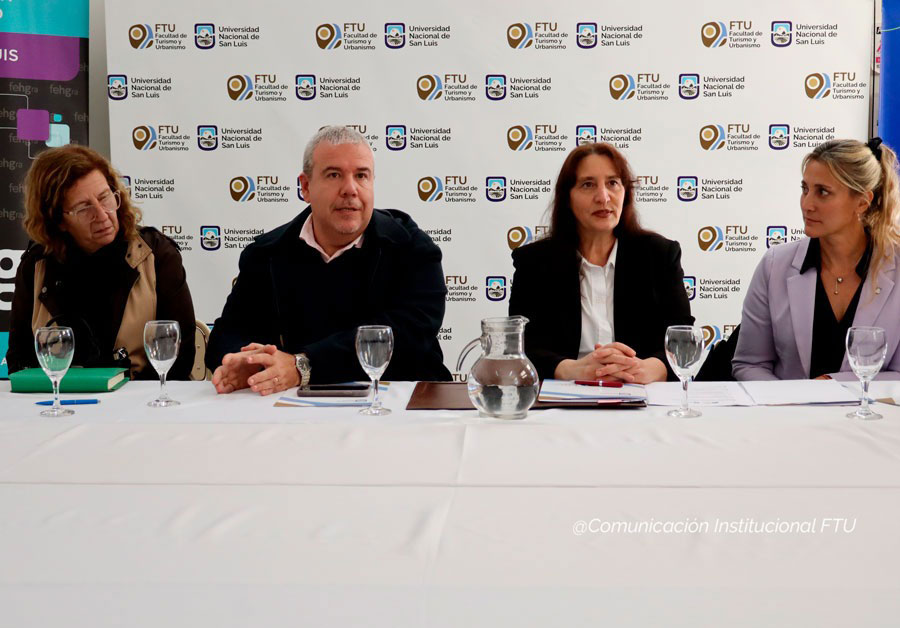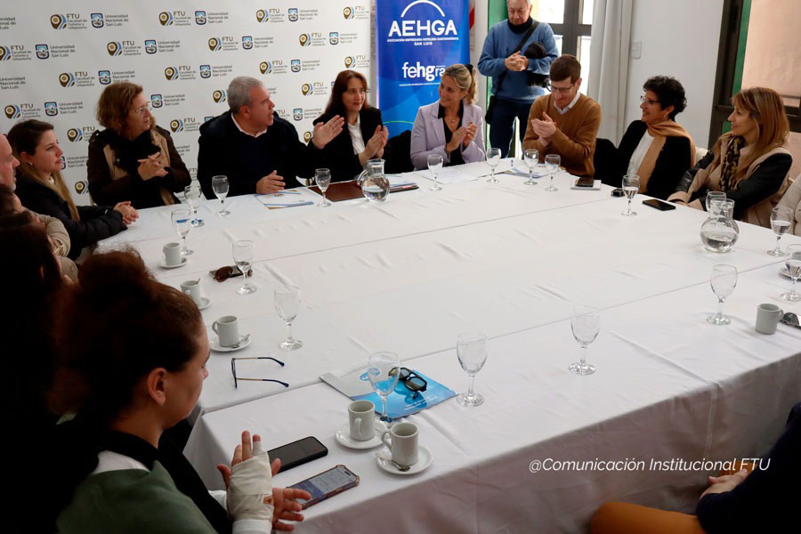 Participaron de la rubrica, la Decana de la FTU, Esp. Agustina Generoso; el Secretario Académico, Mgtr. Pablo Montero; la Secretaria de Extensión y Vinculación, Lic. Mónica Torrez; la Presidente de AEHGA SL, Gabriela Cecilia García y miembros de la entidad sectorial.