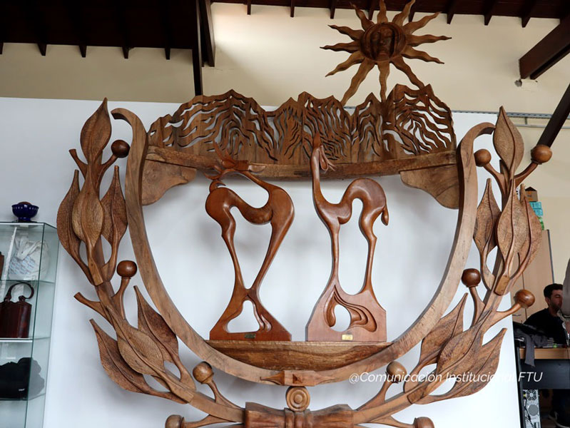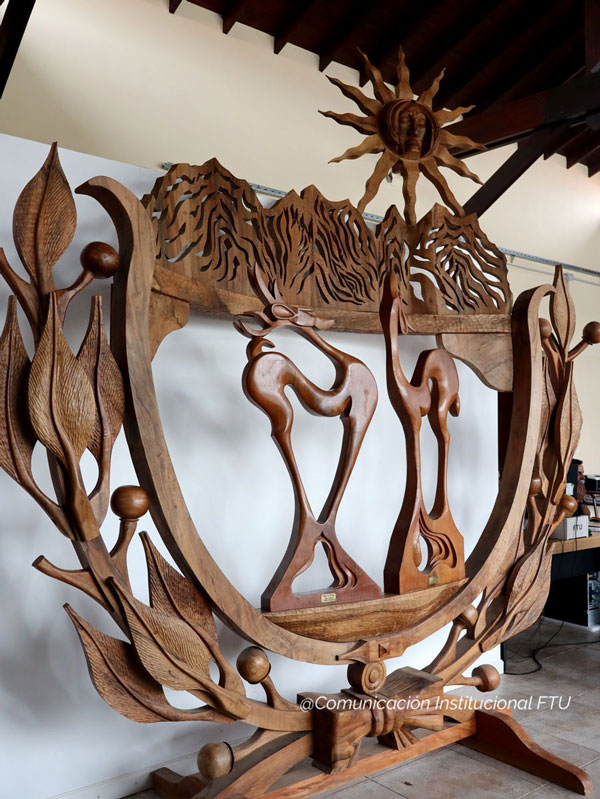 La escultura es una obra de gran porte elaborada en madera de algarrobo y será exhibida de manera permanente en las instalaciones de la Facultad.