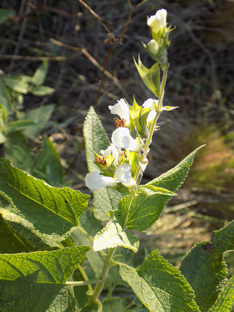 Flores en pseudoracimos axilares y terminales, hasta de 20 cm de largo; brácteas florales pequeñas; cáliz de 4-5 mm de largo, dientes subulados, de 2,5-5 mm de largo, acrescente a la madurez hasta de 10 mm y dientes hasta 5-6 mm; corola blanca o lilacina, tubo de 10-14 mm de largo; estambres insertados por encima del tubo de la corola, apenas exertos.