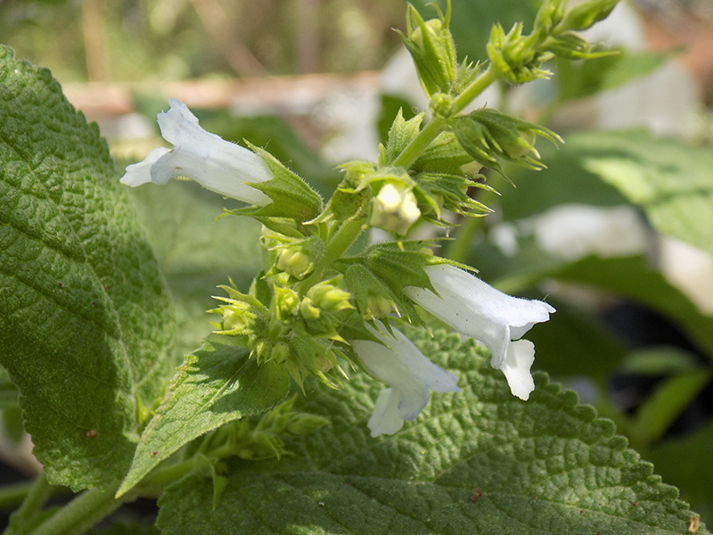 Hojas con pecíolos de 10-13 mm de largo; láminas deltoideo-ovadas, de 4-10 × 2,5-6 cm, base truncada, ápice agudo, margen crenado, cara abaxial densamente pubescente, con pelos ramificados.