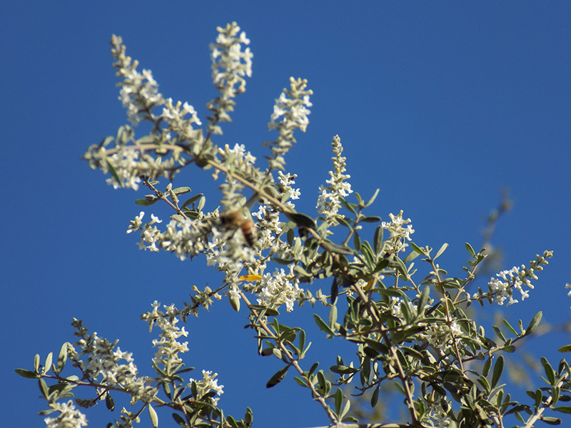 Brácteas florales ovadas, de ápice acuminado, de 1-2 mm de largo, pubescencia escasa, estrigosa, margen ciliado; cáliz de 2-4 mm de largo, híspido, pubescencia densa en la mitad inferior, rala hacia el ápice, dientes subiguales, agudos; corola blanca de 3-5 mm de largo, fauce villosa, subglabra a pubérula en la mitad superior externa; estambres inclusos con el conectivo apiculado.